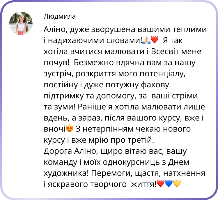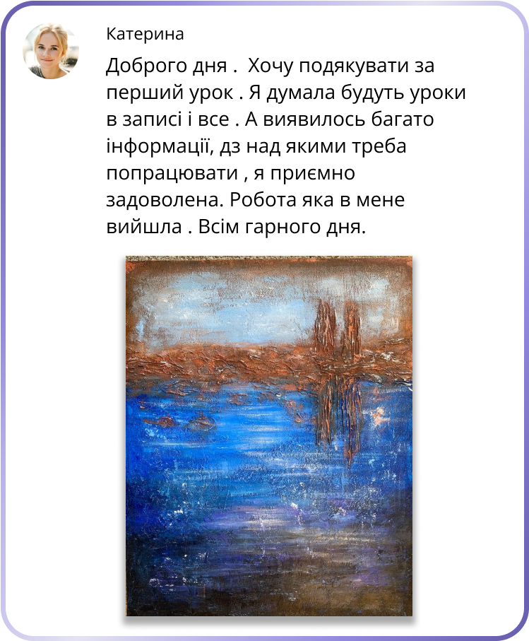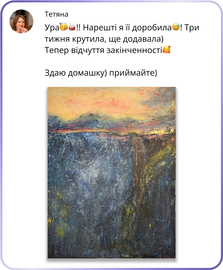 У результаті, ти пройдеш весь шлях створення картини. Матимеш теоретичний фундамент та практичні навички, щоб рухатися далі й творити все краще і краще!